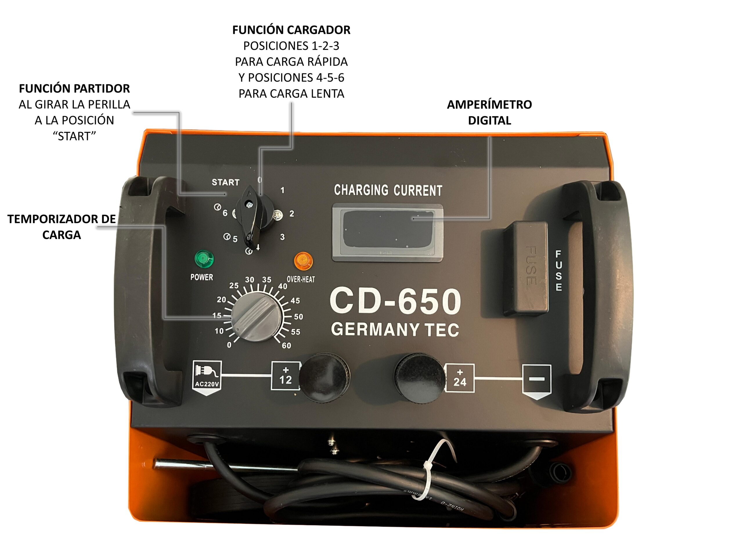 -Accesorios: cable de carga (2.0 + 2.0) m, dos abrazaderas, fusible intercambiable.