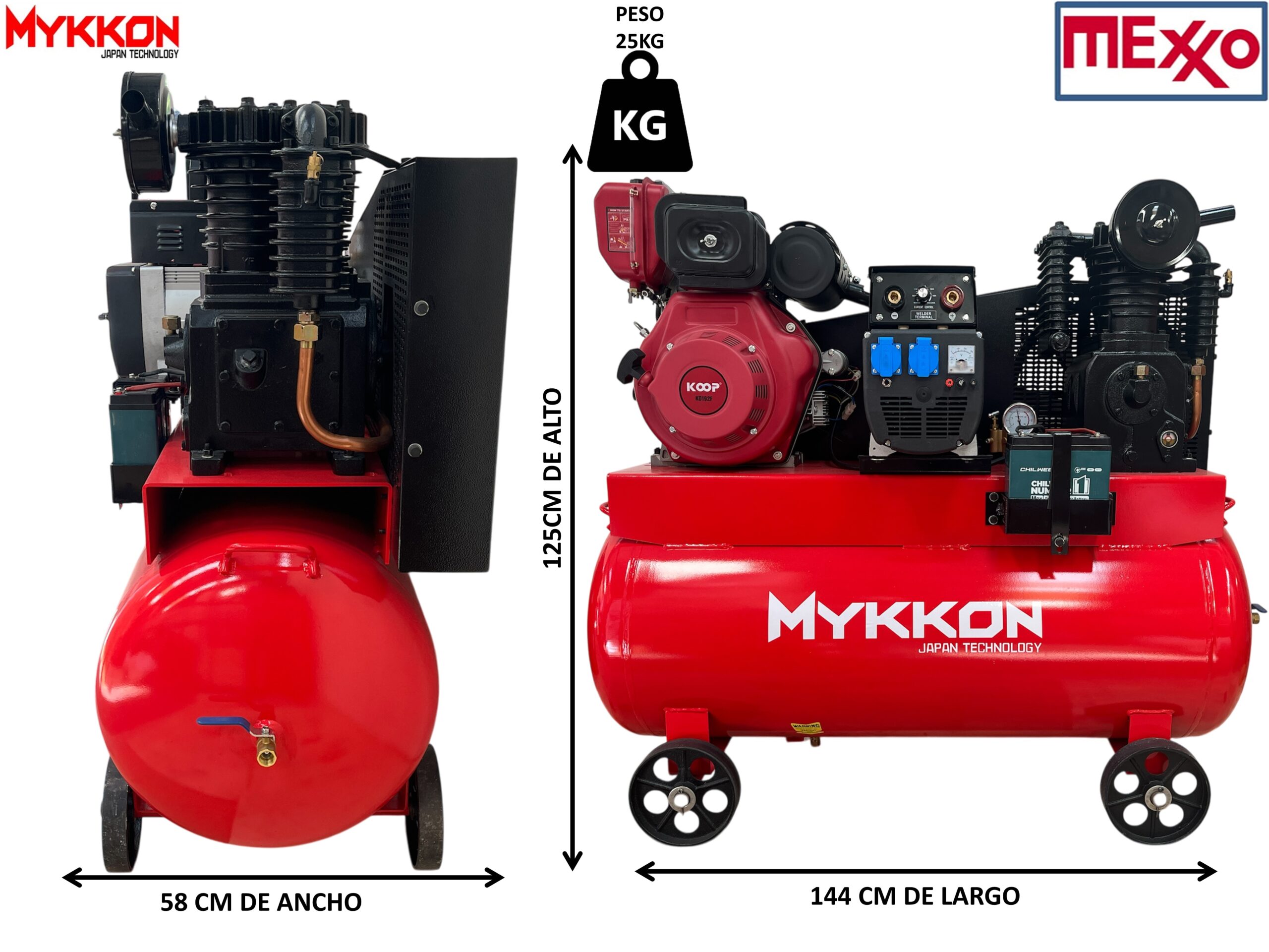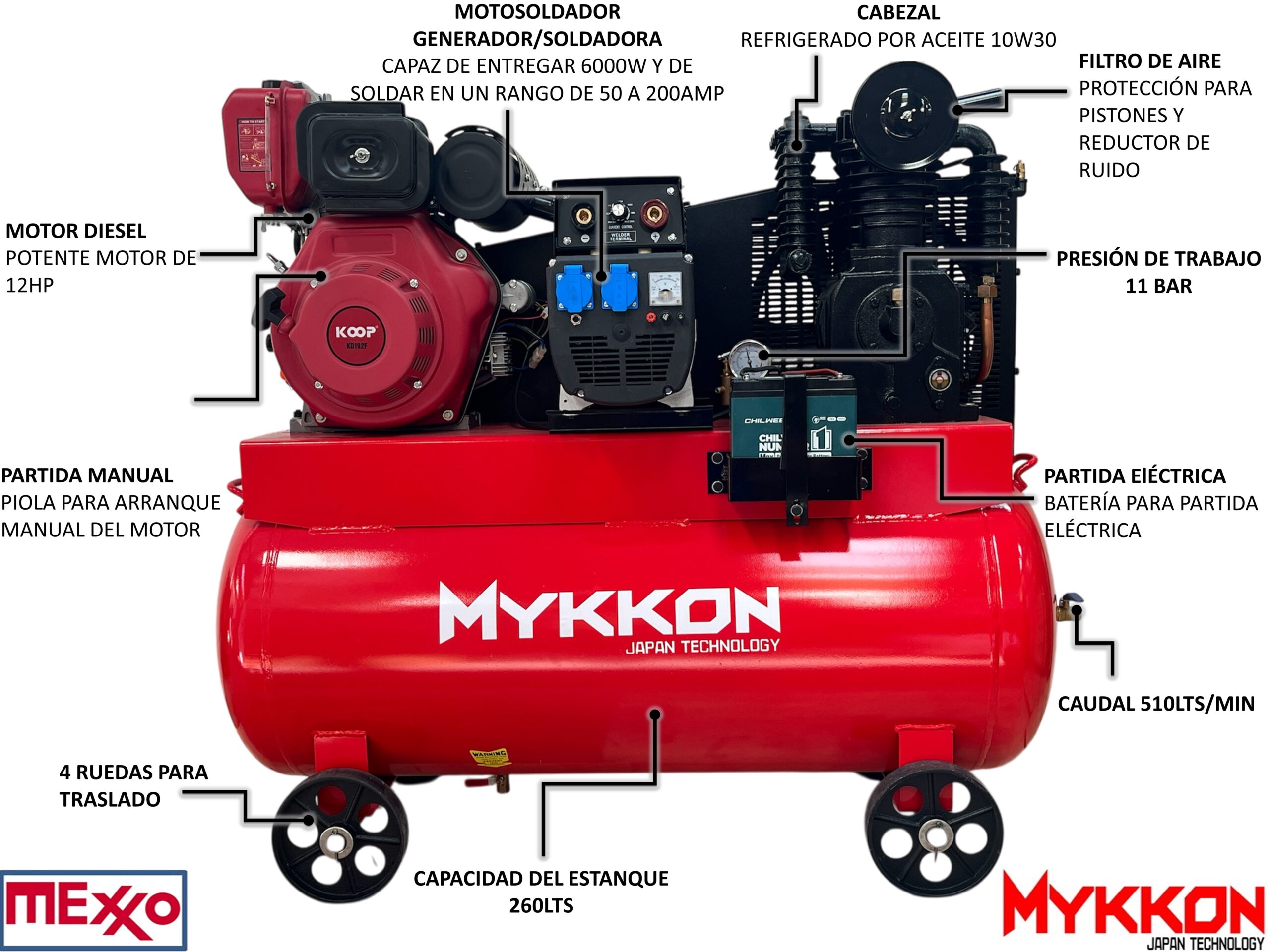 Versatilidad: Tres funciones en un solo equipo — aire comprimido, energía eléctrica, y soldadura.