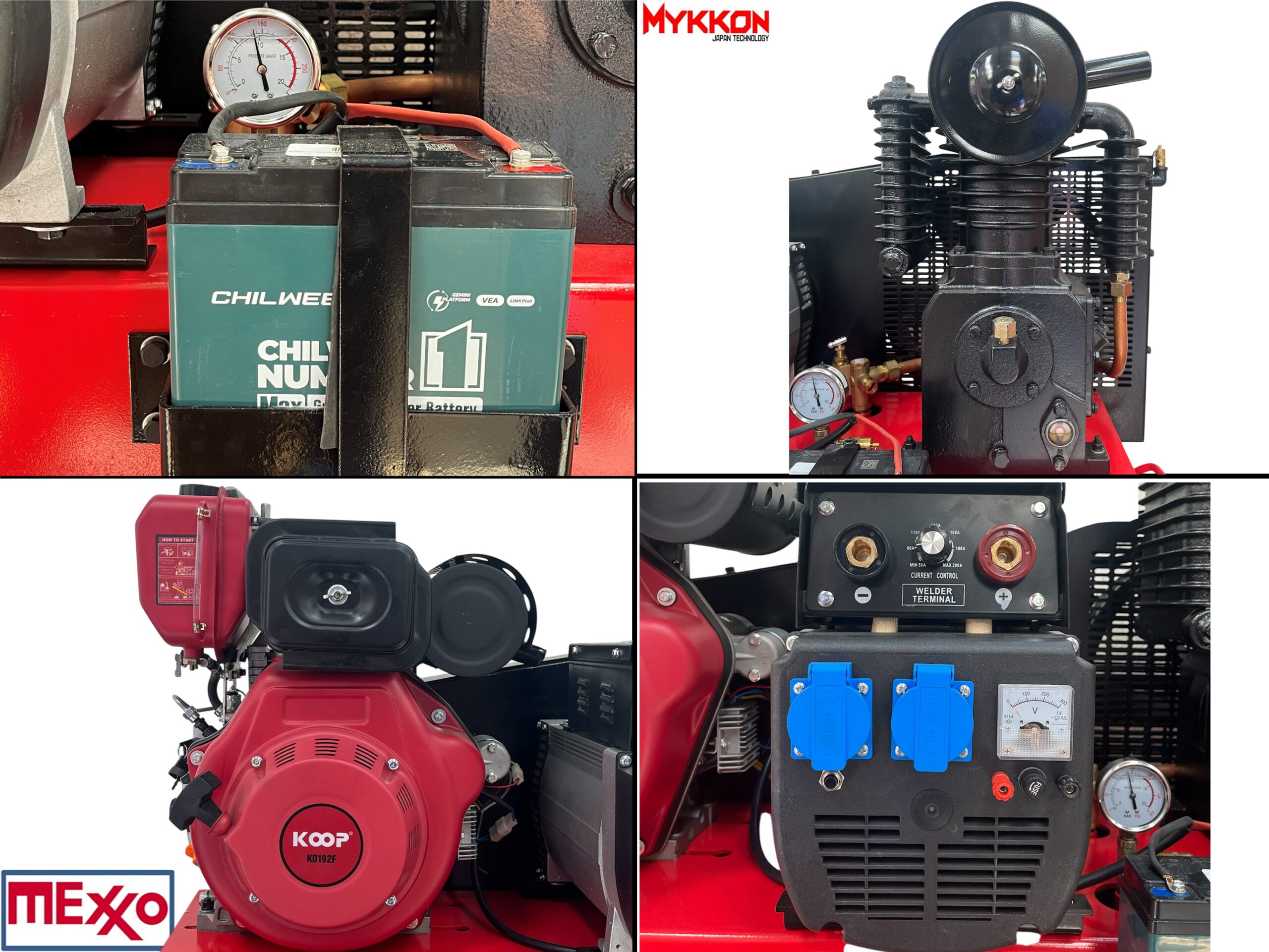 Capacidad de trabajo pesado: El motor de 12 HP y la presión de 11 bar permiten realizar trabajos intensivos, y el rango de soldadura de hasta 200 A es adecuado para trabajos en metal de alta resistencia.