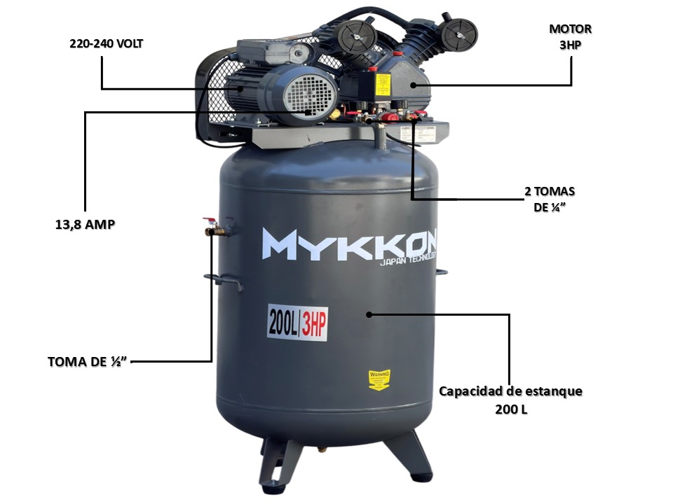 El compresor de aire 200L 3HP es una solución robusta y confiable para talleres, industrias y trabajos exigentes que requieren un flujo de aire constante y eficiente. Su potente motor y su amplio estanque garantizan un rendimiento superior, ideal para alimentar herramientas neumáticas, equipos de pintura, inflado y labores continuas.