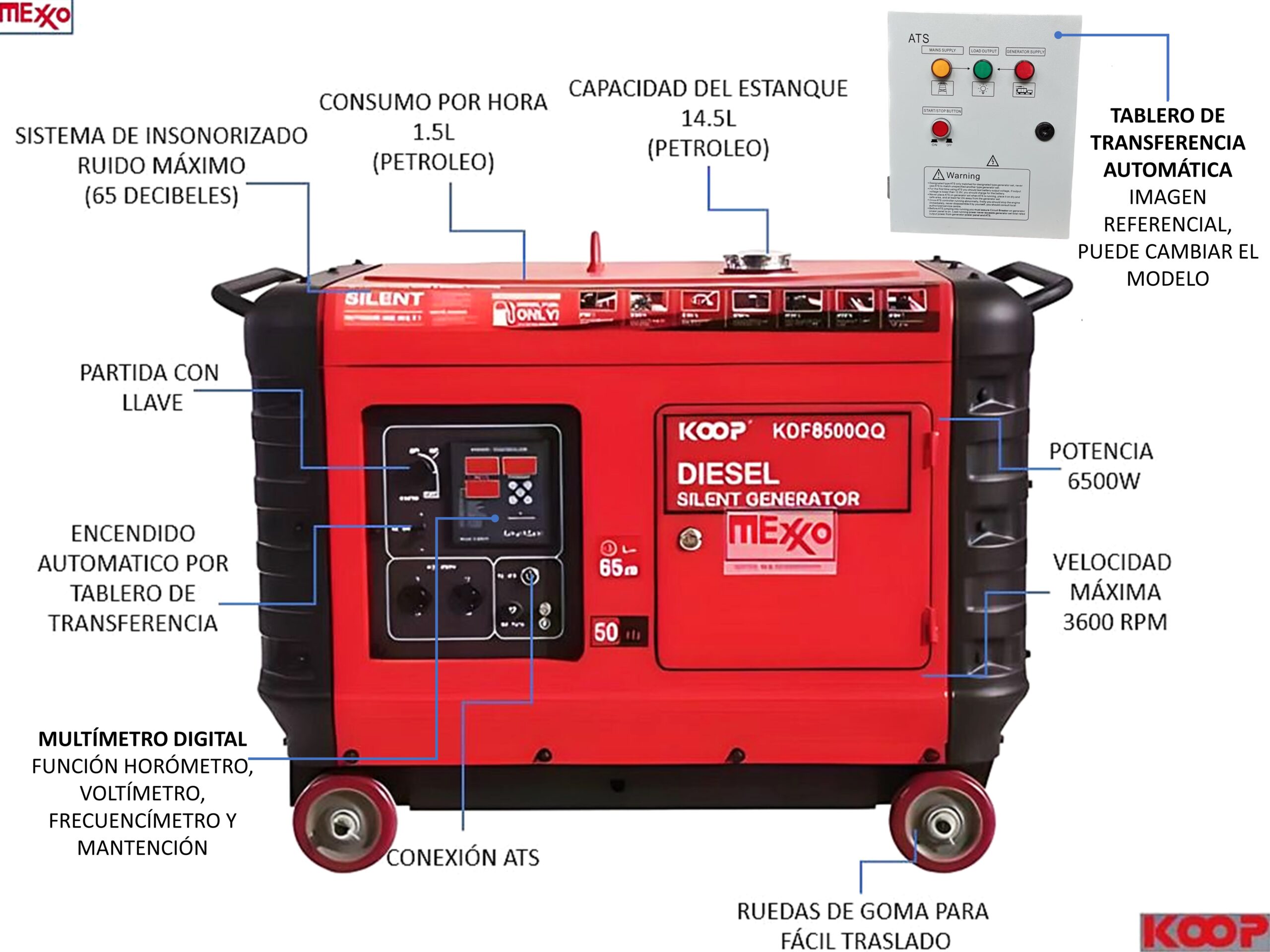 Generador Diesel Super Insonoro 6,5 kVA Koop con Tablero de Transferencia y ATS