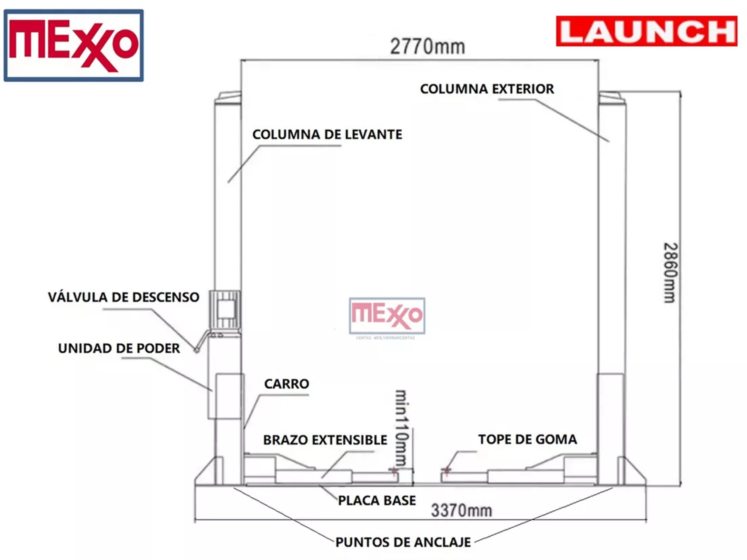 Elevador electro-hidráulico de 4 Toneladas, simétrico de dos columnas, con seguros manuales y control manual. Un elevador de coches económico, de fácil mantenimiento y fiabilidad asegurada.