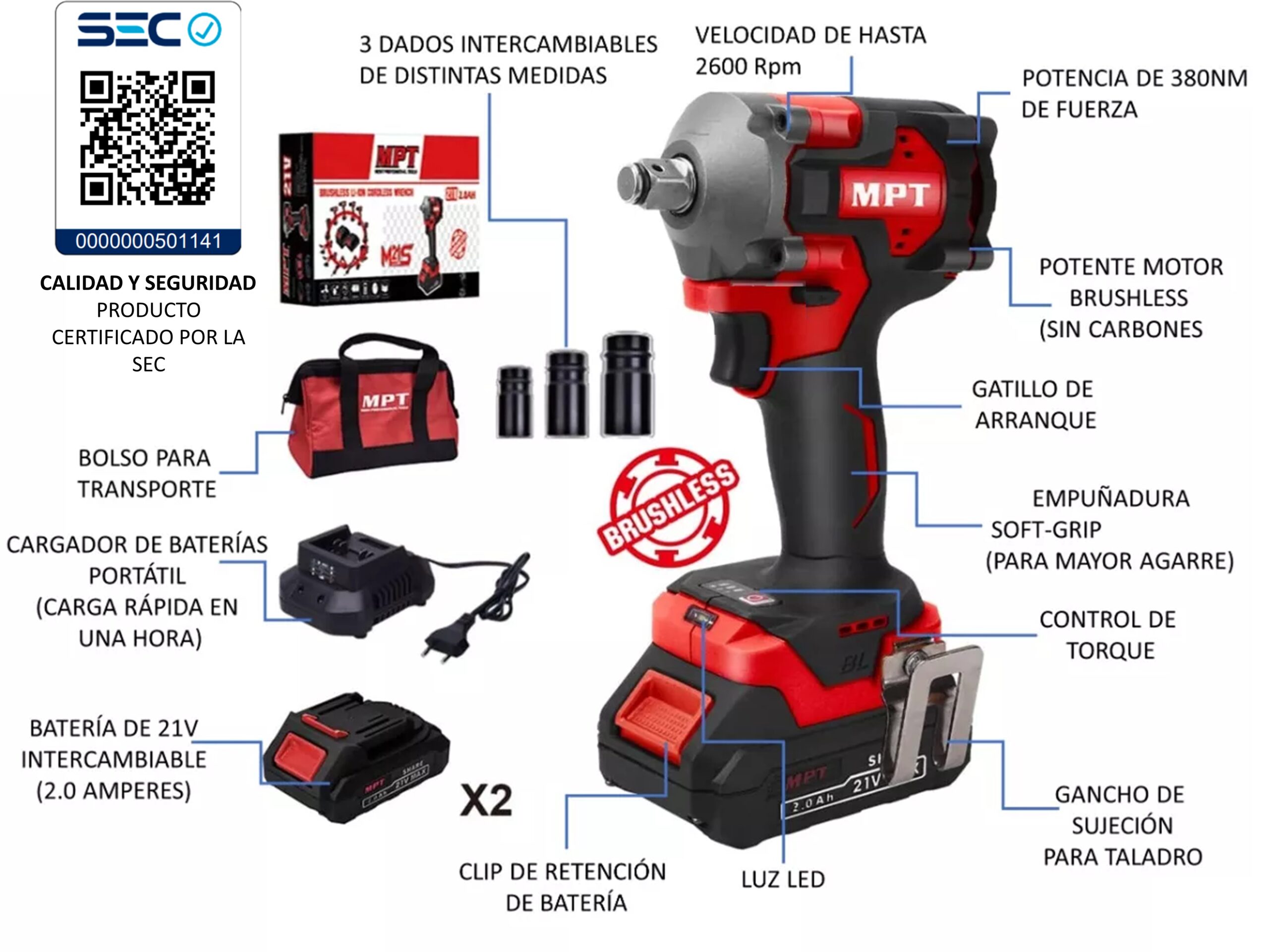 Llave De Impacto Inalambrica 21v 2bat Mpt 380nm Sin Carbones Sello Sec