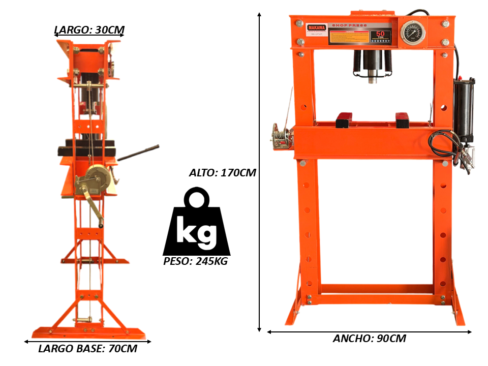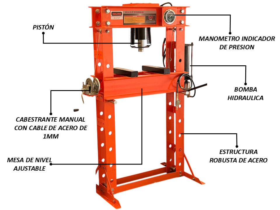 La prensa hidráulica Makawa MKGP50T es un equipo de alto desempeño diseñado para trabajos industriales exigentes, ideal para talleres mecánicos, metalúrgicos y aplicaciones de ensamblaje o extracción de piezas. Con una impresionante capacidad de 50 toneladas de fuerza, garantiza potencia y precisión en cada operación.