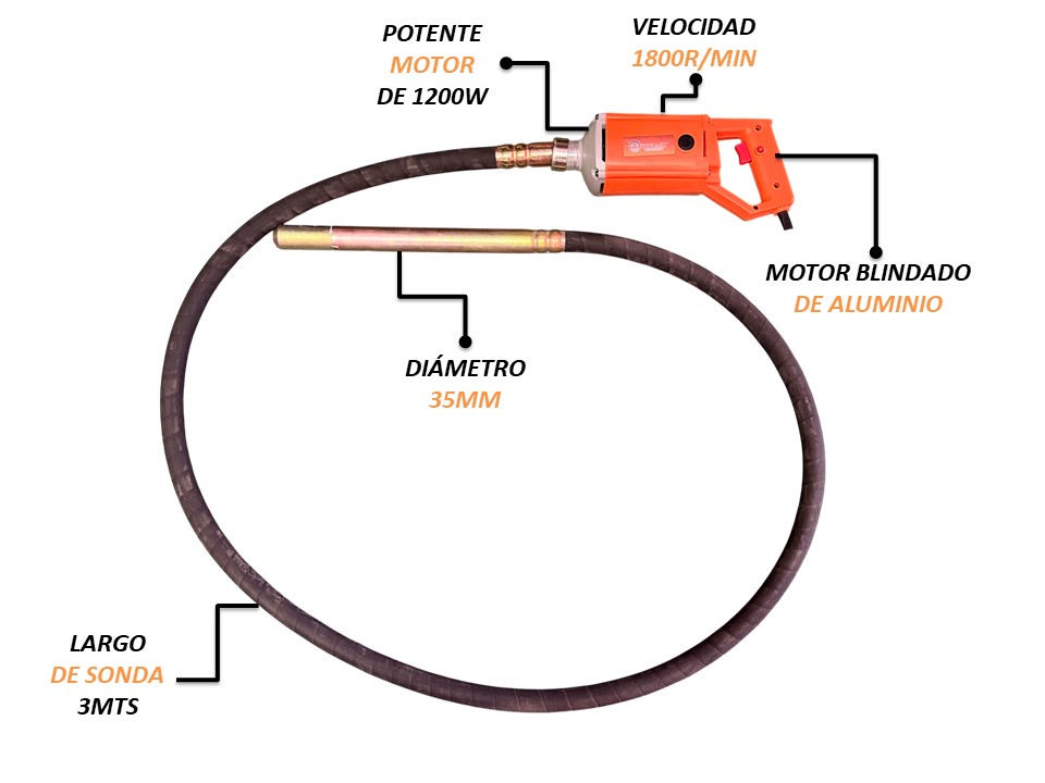 Su potencia de 1200 watts y 1800 RPM garantizan una vibración intensa y uniforme, optimizando el fraguado del hormigón y evitando la formación de burbujas de aire. Incluye una sonda de 3 metros con entrada de 35 mm y fijación por rosca, lo que facilita el montaje y asegura un acople firme y seguro sin necesidad de chaveta.
