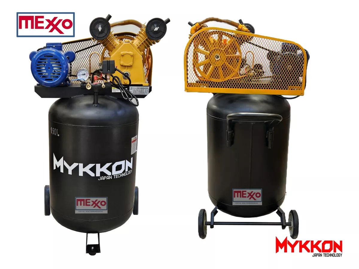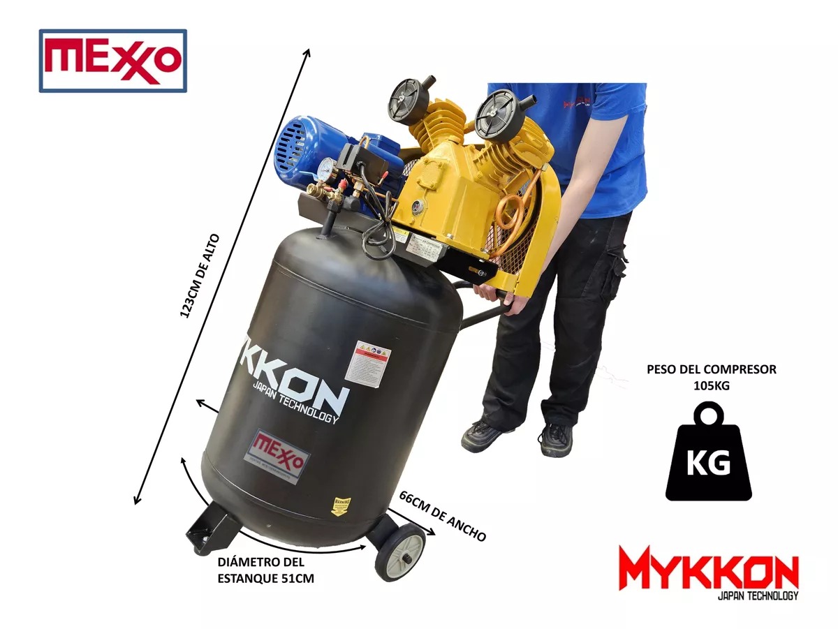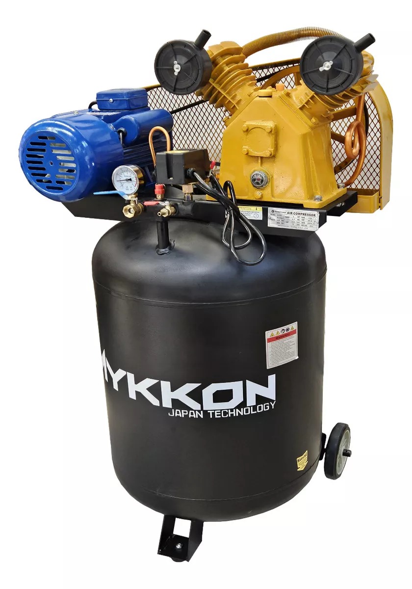 COMPRESOR VERTICAL INDUSTRIAL ESTANQUE 100 LITROS 1.5HP, MARCA MYKKON MONOFÁSICO. AL SER VERTICAL PERMITE AHORRAR ESPACIO.