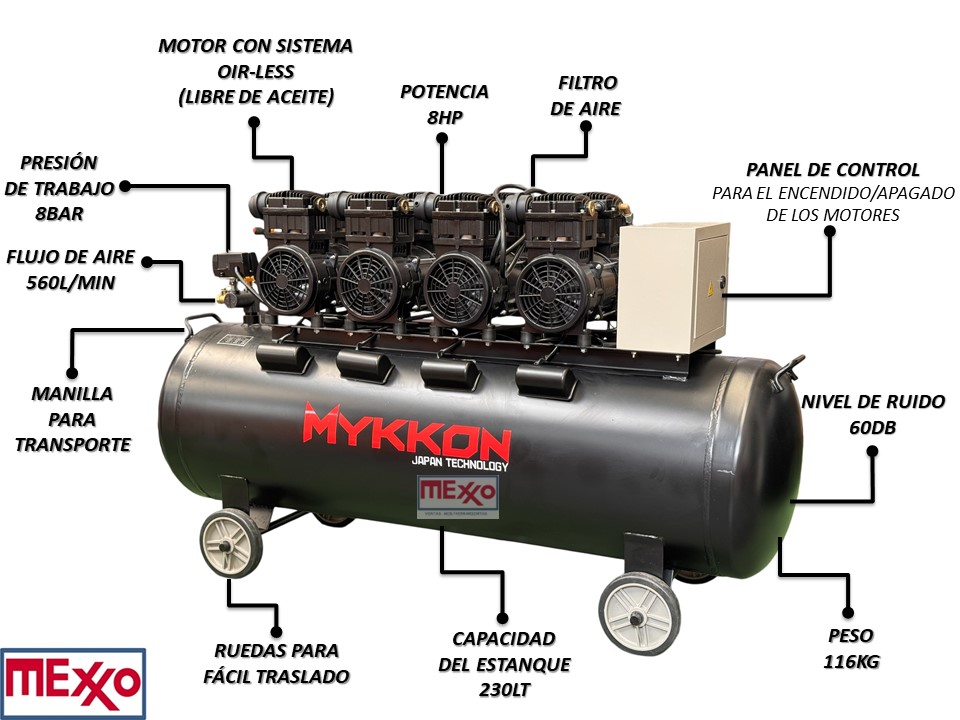 COMPRESOR SILENCIOSO 8HP, 230 LITROS MYKKON JAPON, TECNOLOGÍA CARTER SECO (OIL LESS)