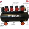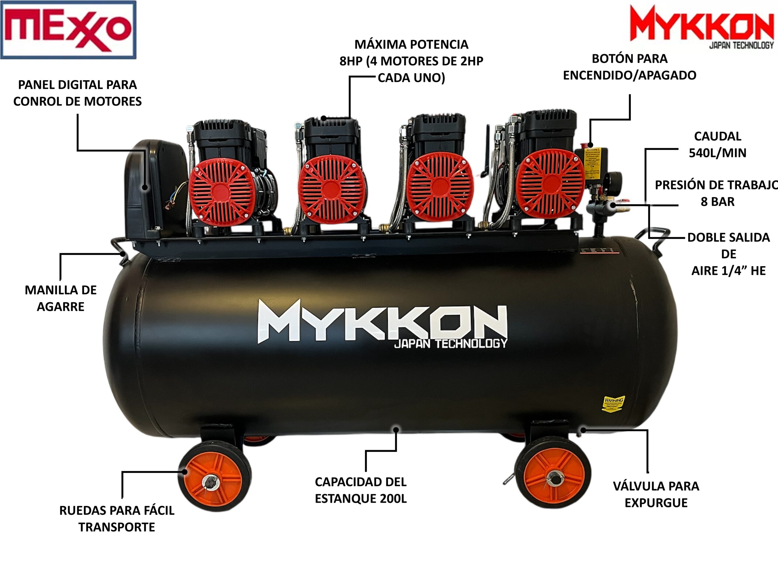 COMPRESOR SILENCIOSO 8HP, 200 LITROS MYKKON JAPON, TECNOLOGÍA CARTER SECO (OIL LESS)